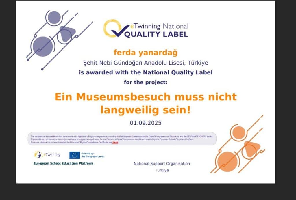 İngilizce öğretmenimiz Gülsen Önbaş rehberliğinde yürütülen “Citizens of the World” ve Almanca öğretmenimiz Ferda Yanardağ rehberliğinde yürütülen “Ein Museumsbesuch muss nicht langweilig sein” (Bir Müze Ziyareti Sıkıcı Olmak Zorunda Değil) isimli projeler; öğrencilerimizin kültürel farkındalık, dil becerileri, dijital yetkinlikler ve iş birliği temelli öğrenme alanlarında gelişimini hedeflemiştir.Projeler; pedagojik yenilik, iş birliği, dijital güvenlik, etkili planlama ve öğrenci katılımı gibi kriterlere göre değerlendirilmiş ve Türkiye Ulusal Destek Servisi (TR NSS) tarafından Ulusal Kalite Etiketi’ne layık görülmüştür.Bu başarı, okulumuzun Avrupa’daki dijital eğitim platformlarında görünürlüğünü artırmış, öğrencilerimizin uluslararası projelerde aktif rol almasına katkı sağlamıştır.Projelerde emeği geçen değerli öğretmenlerimize ve projelerde aktif rol üstlenen tüm öğrencilerimize teşekkür ederiz.